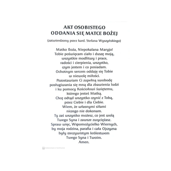 Tekst aktu osobistego oddania się Matce Bożej na odwrocie (zatwierdzony przez bł. Kard. Wyszyńskiego)
